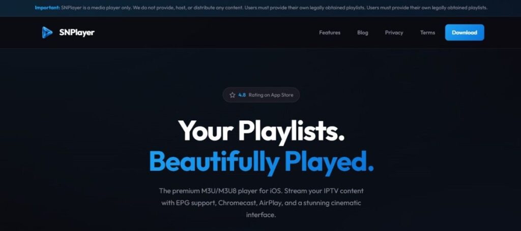 SNPlayer IPTV Player is an IPTV streaming application developed mainly for Apple devices. It allows users to watch IPTV channels by importing their own playlists.The player supports common IPTV formats such as M3U and M3U8, which are widely used by IPTV services.